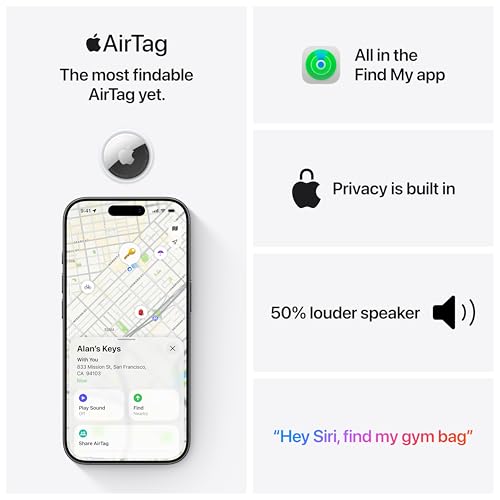 The Apple AirTag (2nd Generation) is designed to help you keep track of your most important items effortlessly. With a quick one-tap setup on your iPhone or iPad, you can attach an AirTag to keys, wallets, bags, or other valuables and locate them easily through the Find My app. This updated version features enhanced Ultra Wideband and Bluetooth chips that extend the precision finding range, allowing you to receive step-by-step directions to your lost item on both iPhone and Apple Watch. The louder speaker ensures you can hear the AirTag’s distinctive chime even in noisy environments. Privacy remains a top priority with AirTag; only you or authorized users can see its location, and no location data is stored on the device itself. The device also supports secure temporary location sharing with trusted contacts or select airline partners, adding convenience if you lose something important while traveling. Battery life lasts over a year under typical usage and is easily replaceable when needed, so you don’t have to worry about frequent charging. Additionally, Apple has improved the sustainability of the AirTag by incorporating recycled plastics in its enclosure and using fiber-based packaging, reflecting a commitment to environmental responsibility.