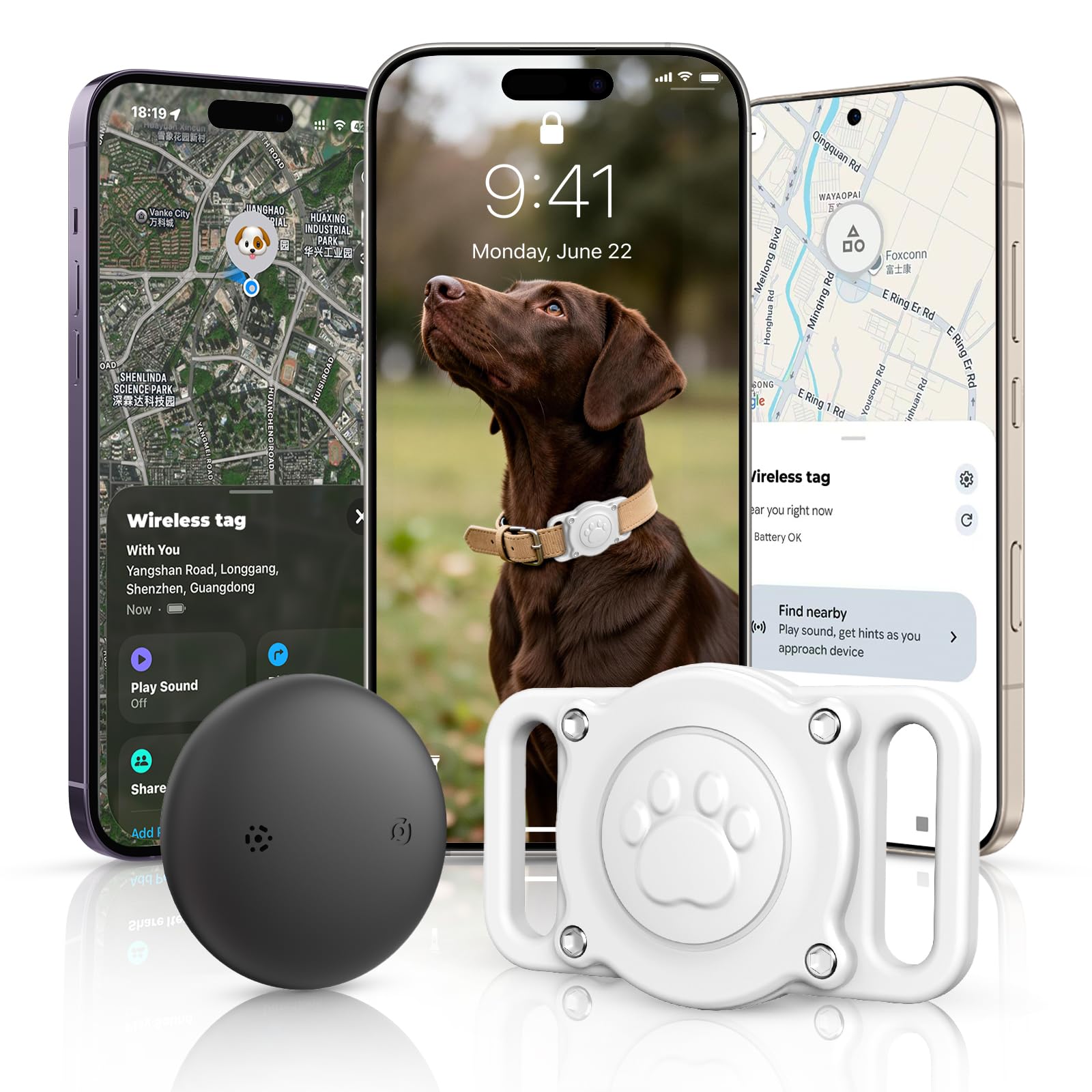 - Real-Time Tracking for iOS & Android: Bluetooth Technology Enables both iOS and Android users to use the 'Find My' app: you can track your Pet in seconds, and Built-in Ringing the app to quickly locate your pet when it's nearby but out of sight.