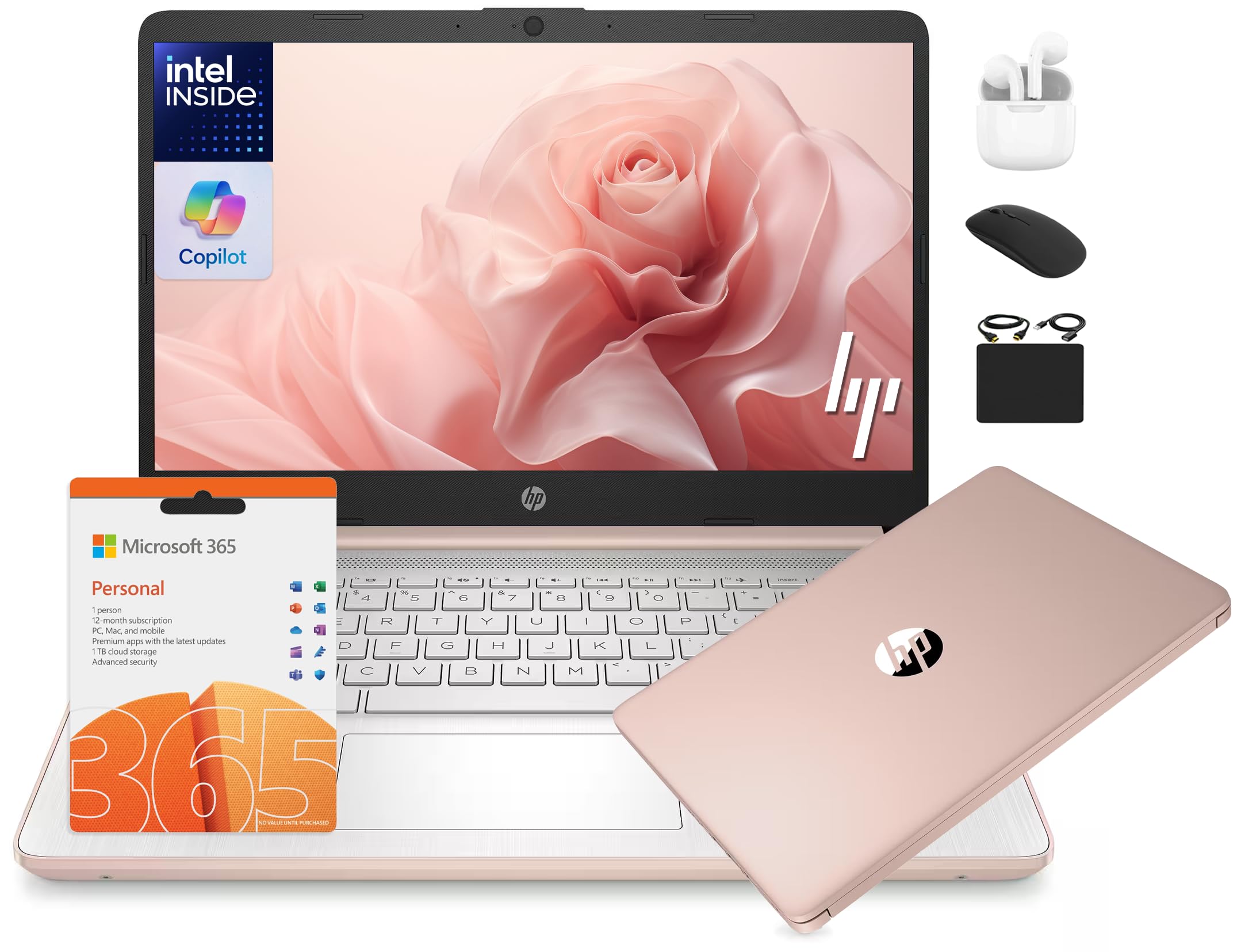 HP 14 Laptop Student Business 2025 Flagship, AI Copilot, 4-Core 13th Gen Intel CPU, 16GB RAM 628GB Storage (128GB UFS+ 500GB Ext), 1-Yr Office 365, Long Battery HubxcelAccessory Win 11S Rose Gold